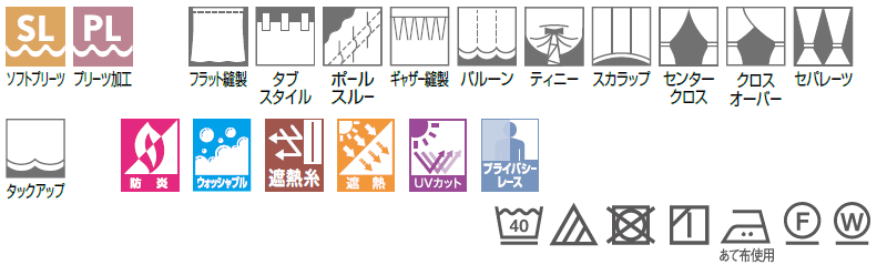 有効巾:100cm◯リピート/ タテ8.4cm ×ヨコ16.6cm ◯組成/ ポリエステル100% ◯日本製 ◯寸法変化率/ 水洗い:タテ-1%・ヨコ-1% ドライ:タテ-1%・ヨコ1% ◯取扱い絵表示/T-A1 オーダーカーテンの縫製についてオーダーカーテンは、カーテンの生地を2倍使用して作った2倍ヒダカーテンと、1.5倍使用した1.5倍ヒダカーテンそして1.3倍使用したフラットカーテンがあります。