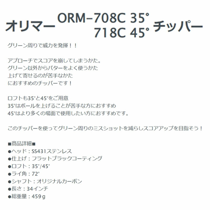 このチッパーを使ってグリーン周りのミスショットを減らしスコアアップを目指そう! オリマー チッパーカーボンシャフト ブラック 黒 Japan TOKYO golf clubs shop. machino golf yasan.グリーン周りのミスショットを減らしスコアアップを目指そう! オリマー ORM-708C-35°, 718C-45° チッパー オリジナルカーボンシャフト 34インチ ORLIMAR Chipper Original Carbon Shaft 34in 22sp ◆在庫につきまして◆ こちらの商品は、お取り寄せになる場合がございます。