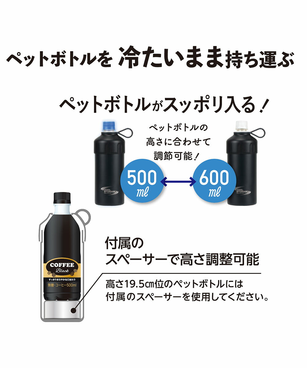 ・500ml・600mlのペットボトル保冷専用ケースですが、ペットボトルの形状によっては使用できない場合があります。