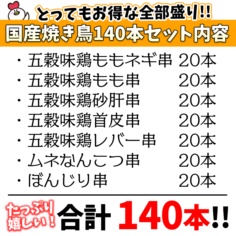 国産 焼き鳥 全部盛り 140本セット 送料無料 焼鳥 ヤキトリ やきとり 冷凍 業務用 BBQ 五穀もも串 五穀ももねぎ串 五穀砂肝串 五穀レバー串 五穀味鶏首皮串 ムネ軟骨串 国産ぼんじり串【0904-ss】