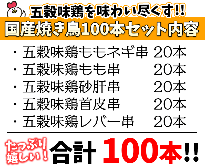 国産 焼き鳥 五穀味鶏 100本セット(5種) 送料無料 食べ比べ 焼鳥 盛り合わせ ヤキトリ やきとり 業務用 レバー 砂肝 鶏もも ねぎま BBQ イベント アウトドア【0904-ss】