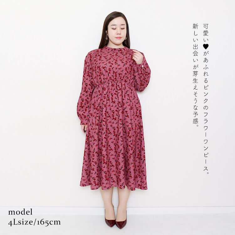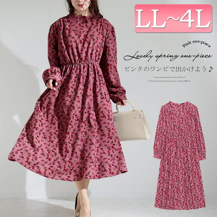 大きいサイズレディース ワンピース 小花柄長袖ワンピース 長袖 総柄 くびれ ウエストゴム フレア フラワー ワンピ 花 可愛い 膝下丈 フレアスカート コーデュロイ ボタン ふんわり袖 大人 ゆったり 体型カバー 春新作 秋服 春服 冬服 LL 2L 3L 4L ピンク ゴールドジャパン