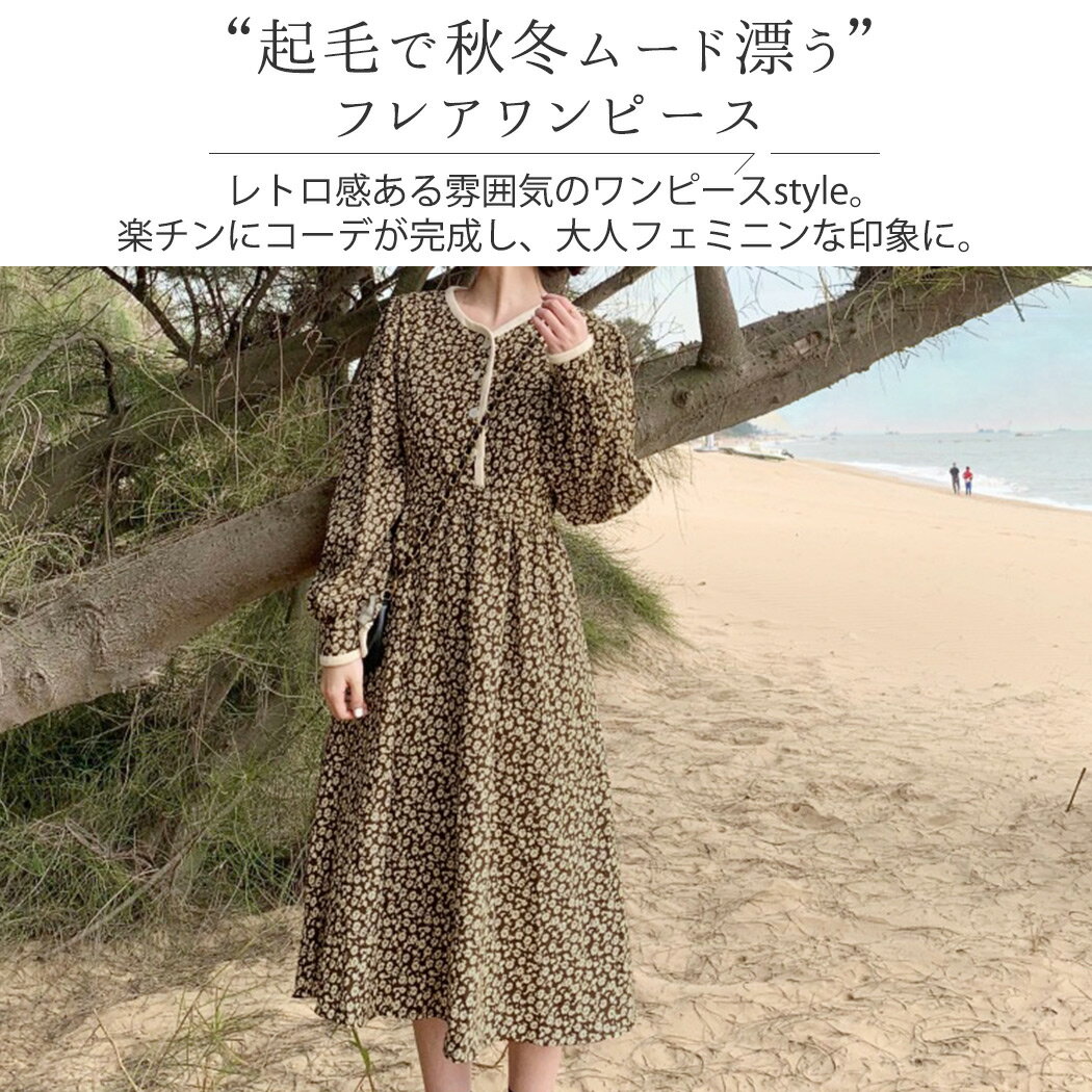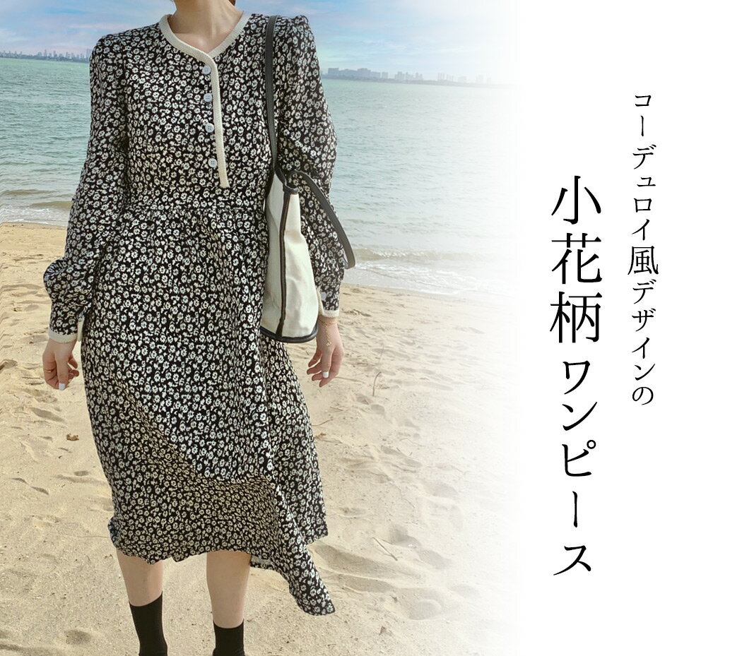 ワンピース 秋 レディース 長袖 黒 ゆったり 春 可愛い Aライン ミモレ丈 ポリエステル100% ノーカラー フロントボタン 小花柄 フラワープリント レトロ フレアスカート 細見え ウエスト切り替え ウエストギャザー パフスリーブ ぽわん袖 普段着 大人 通勤 OL 着回し デート