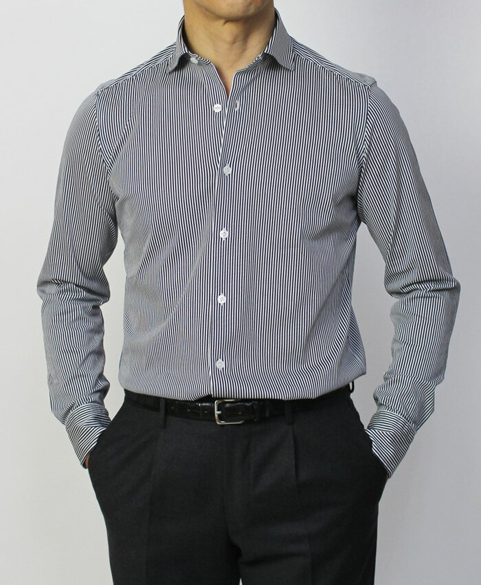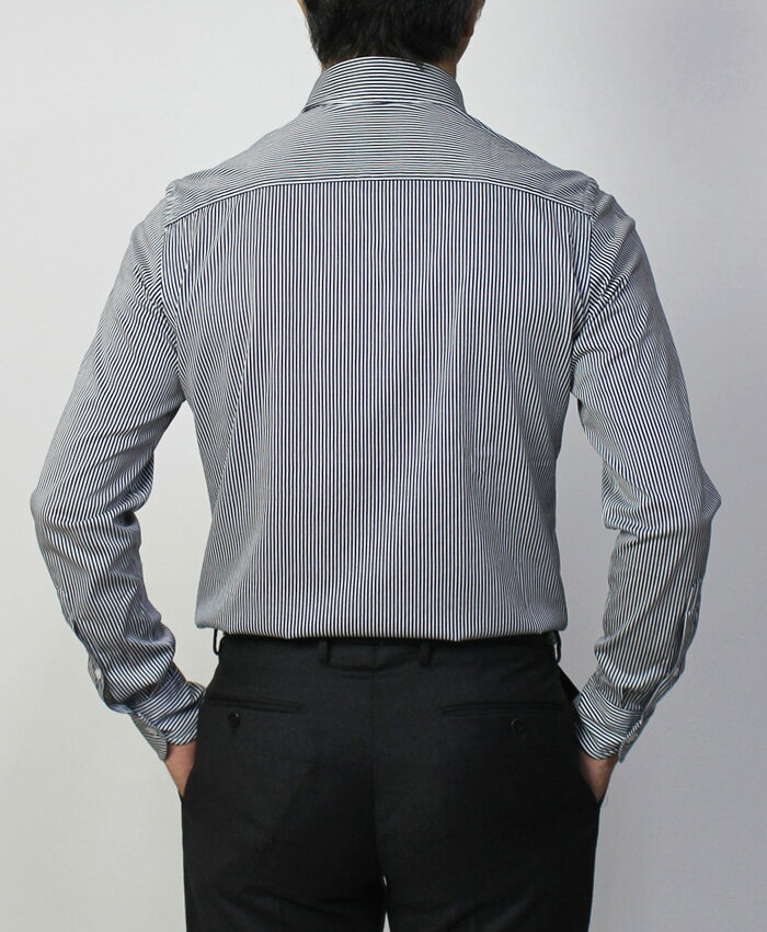 サイズガイド / SIZE GUIDE モデル:身長175cm 体重65kg ウエスト78cm バスト94.5cm 裄丈84cm 首廻り40cm ヒップ89cm モデル着用サイズ:Size 38 商品コード : 8003173x51 製造元 : イタリア 素材 : コットン100%【国内正規品】ソンリーサ / SONRISA / セミワイドカラー シャツ / コットン ジャージー ストライプ プリント / B878-J823【ネイビー】