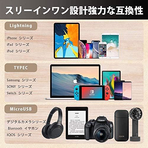 巻き取るときも、両端を同時に引っ張ってから手を緩めるとケーブルは自動的に収まります 注意:(両端を同時に引っ張ってください! 1つを引っ張らないと役に立ちません!)【データ高速転送 急速充電】3 in 1: Lightning + Micro USB + Type-C で、データ転送、急速充電ができます。