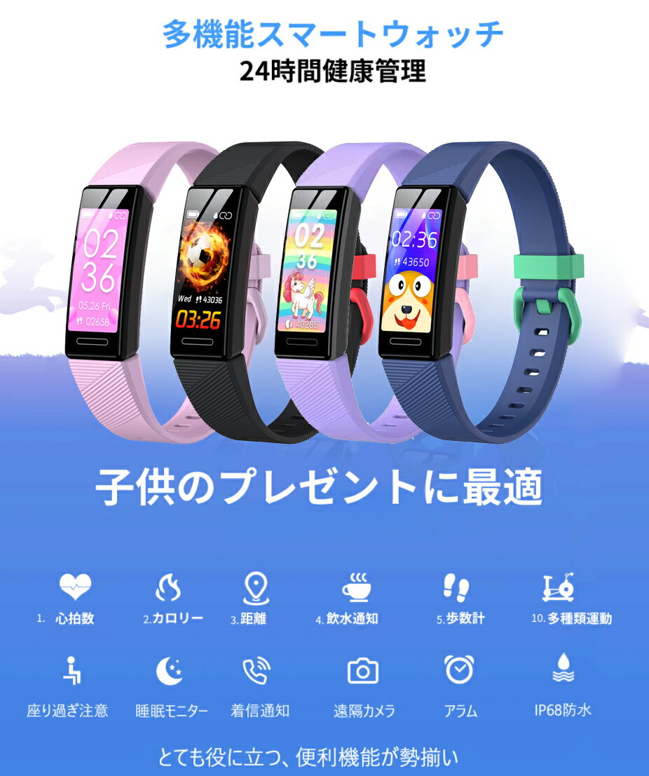 商品仕様 本体素材 PC+ABS ハンド素材 シリコン スクリーン 0.96インチIPSカラースクリーン サイズ 約250×10.5×19.5mm 重量 約25g リストハンド 長さ250mm,調節可能サイズ145-195mm バッテリー容量 105mAh 対応機種 iOS 9.0以上、 Android 4.4以上 Bluetooth V4.0 解像度 160*80 充電時間 約1H 充電方式 USB充電 使用時間 約5-7日間 防水仕様 IP68防水 仕様対象 12歳以上のお子様 セット内容 本体、日本語取扱説明書 保証期間 ご購入日から6ヵ月 機能 心拍計、睡眠モニター、座りがち、多機能健康管理、着信通知、多種の運動モード、カメラ遠隔操作、ミュージック、アラーム、明るさ調節 、待機時間調整、ストップウォッチ、女性生理周期、スマートウォッチ探し… 商品特徴 【多種多様な子供に向ける文字盤】 初期画面の時計画面には沢山のデザインからお好きな画面をお選び頂けます。