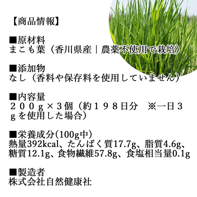 原材料名 まこも葉(香川県産|農薬不使用で栽培) 添加物 なし(香料や保存料を使用していません) 内容量 200g×3個(約198日分 ※一日3gを使用した場合) 栄養成分(100g中) 熱量392kcal、たんぱく質17.7g、脂質4.6g、糖質12.1g、食物繊維57.8g、食塩相当量0.1g 保存方法 高温多湿を避け、冷暗所で保管してください。