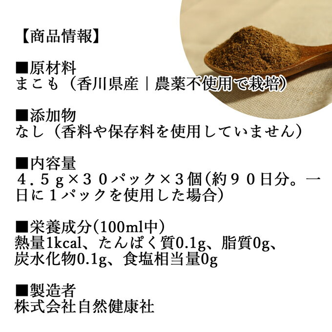 原材料名 まこも(香川県産|農薬不使用で栽培) 添加物 なし(香料や保存料を使用していません) 内容量 4.5g×30パック×3個(約90日分。