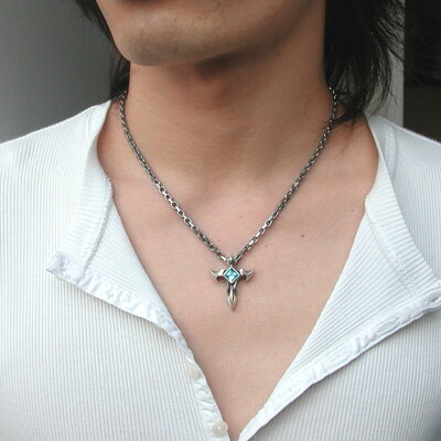 神秘すら感じるほどのクロスには、ブルーとパーズが埋込まれたシルバーペンダント。